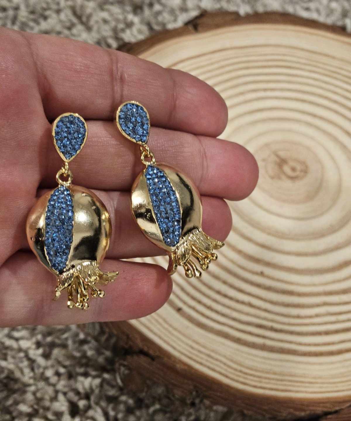 Celebrate the rich symbolism of the pomegranate with these exquisite 24K gold-plated bronze earrings, adorned with dazzling marcasite stones in a choice of vibrant colors: blue, green, silver, or burgundy. Handcrafted by skilled Turkish artisans, these earrings are a stunning blend of tradition and modern elegance.