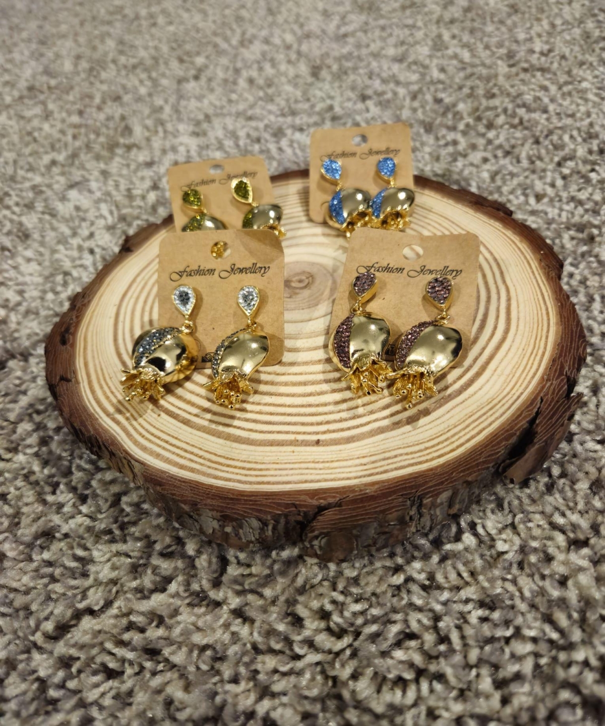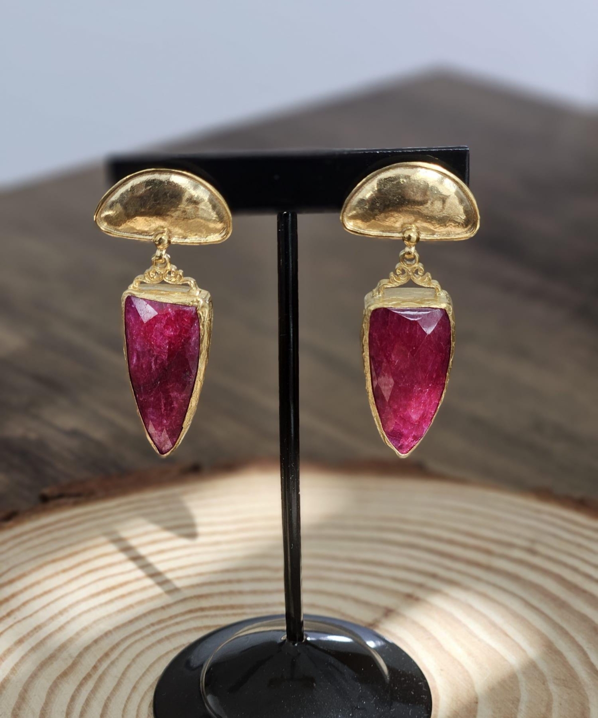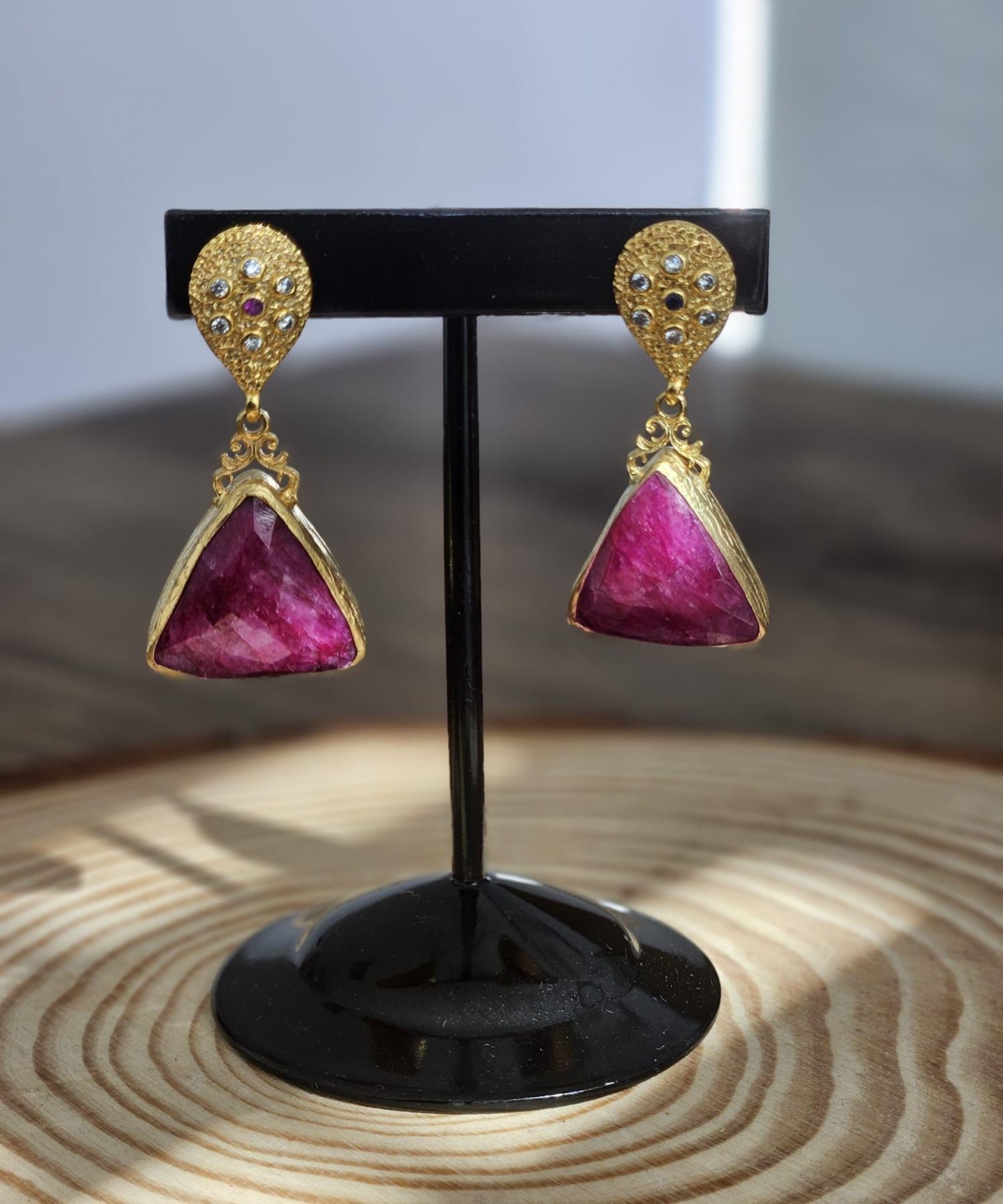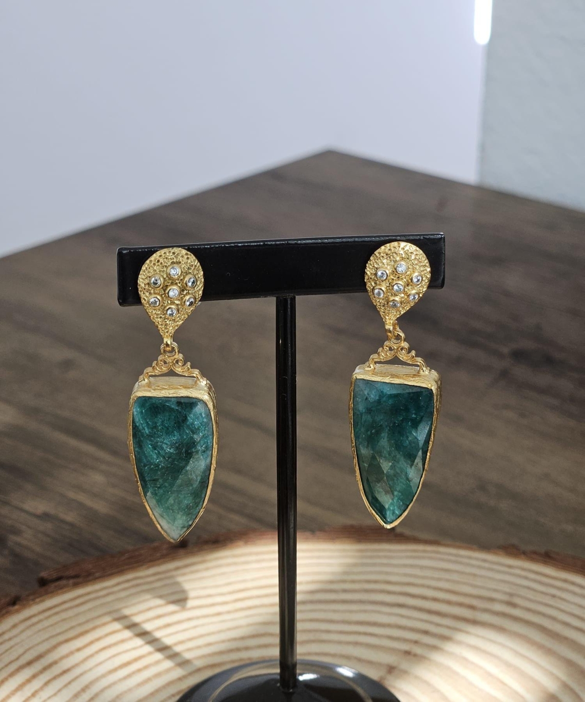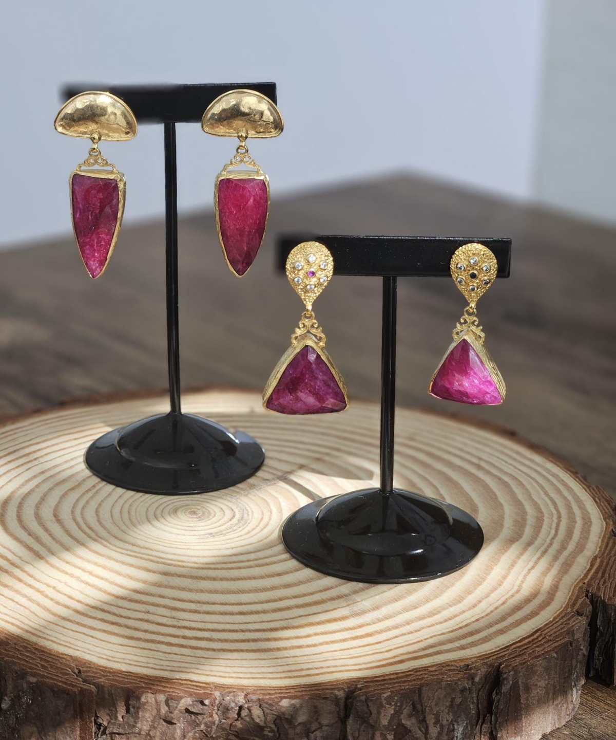 22K Gold-Plated Ruby and Emerald Earrings: Timeless Turkish Elegance Enhance your style with the radiant beauty of these 22K gold-plated bronze earrings , featuring captivating Ruby or Emerald stones complemented by sparkling white zircon accents. Handcrafted at the esteemed Naturel Jewelry workshop , these earrings are a true testament to Turkish craftsmanship and refined elegance. Key Features: Material : Made from sturdy bronze and plated with 22K gold for a sophisticated and long-lasting finish. Design : Adorned with your choice of either deep red Ruby stones or vibrant green Emerald stones, each earring is accentuated by brilliant white zircon details for added sparkle. Customizable : Select your preferred stone color during purchase to match your unique style or mood. Hypoallergenic : Designed to be gentle on sensitive skin, ensuring comfort for all-day wear. Waterproof : Resistant to water exposure, maintaining their luxurious shine over time. Care Instructions: To preserve the beauty of your earrings: Avoid direct contact with perfume or chemicals to prevent the gold plating from darkening. Gently clean with a soft, dry cloth after wearing to maintain their radiance and brilliance. Why Choose These Earrings? Versatile Style : Perfect for both everyday elegance and special occasions, offering a touch of timeless charm. Thoughtful Gift : A meaningful present for loved ones, symbolizing luxury and sophistication. Turkish Craftsmanship : Handmade with precision at the Naturel Jewelry workshop , reflecting the artistry and heritage of Turkish jewelry-making. Elevate your accessory collection with these stunning Ruby or Emerald earrings , blending traditional beauty with modern sophistication. Choose your favorite gemstone color and let these earrings become a treasured addition to your wardrobe.