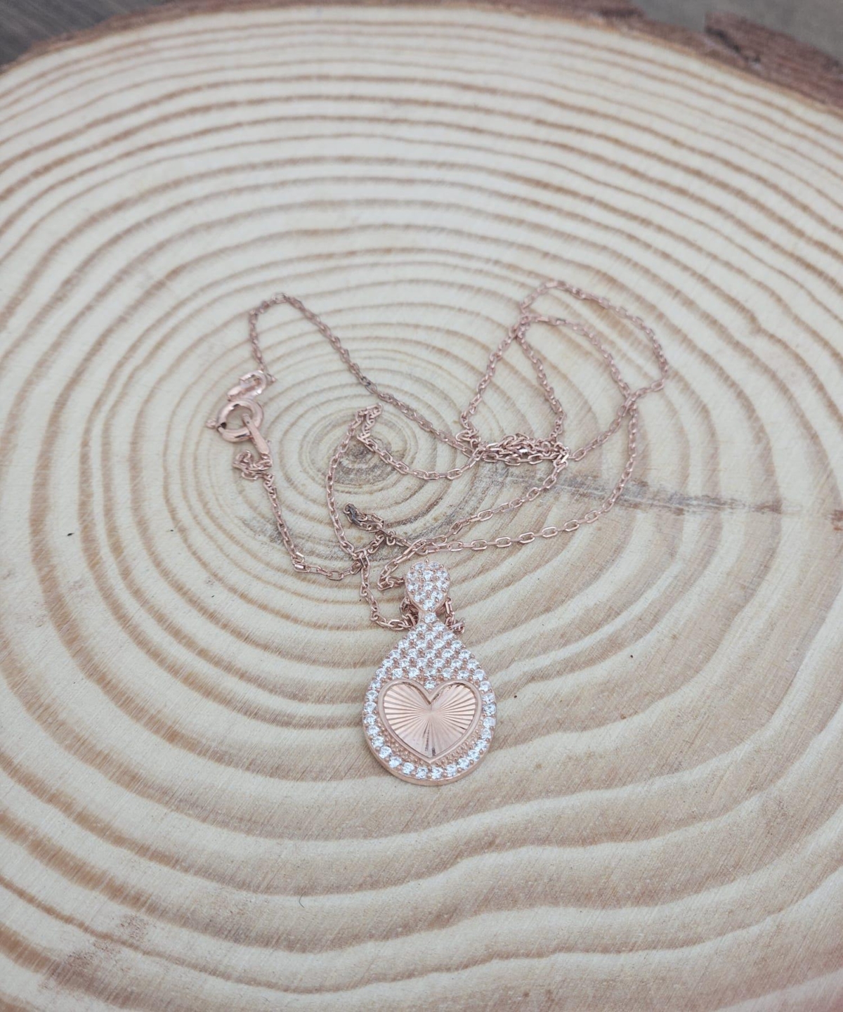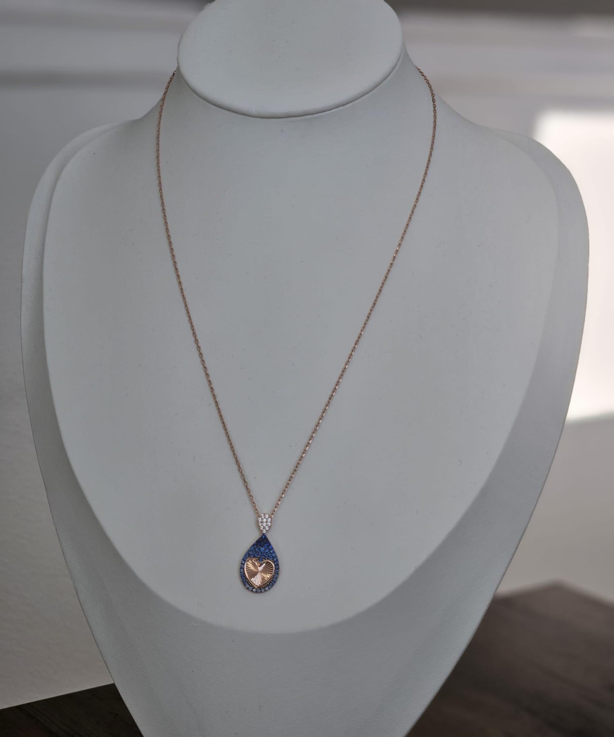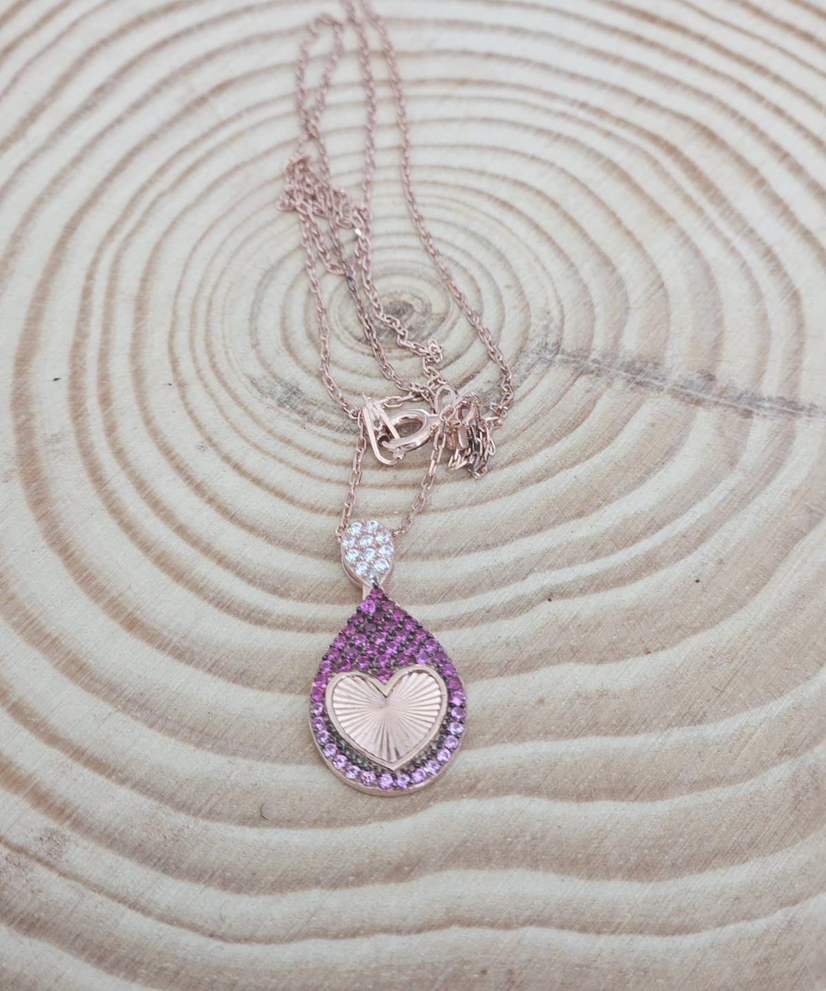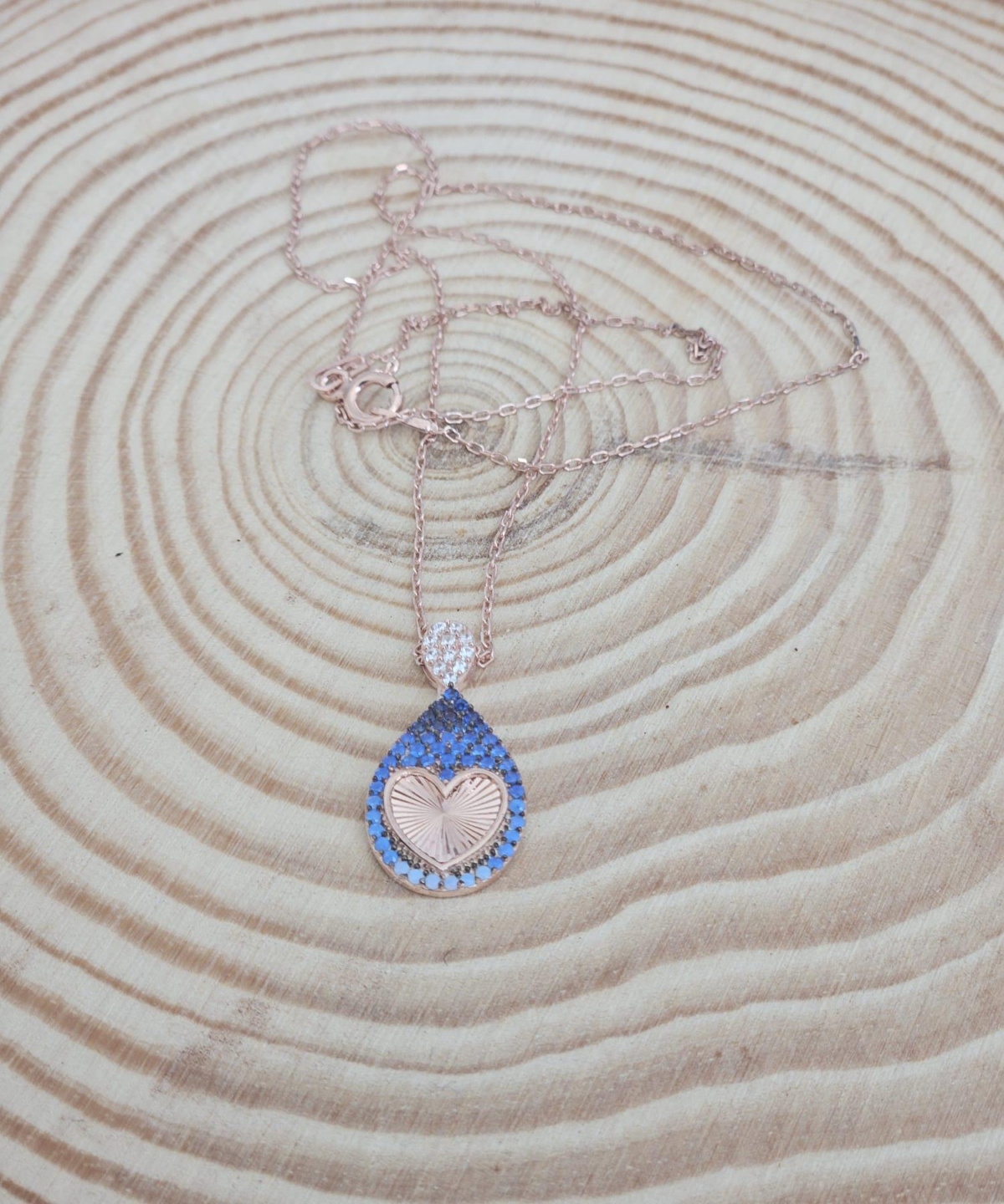 Delicate silver heart pendant with a luxurious rose-gold finish, beautifully encrusted with sparkling zirconia. The pendant comes with a matching chain and is available in your choice of blue, white, or purple zirconia stones. A perfect blend of elegance and personalization, ideal for any occasion or as a heartfelt gift