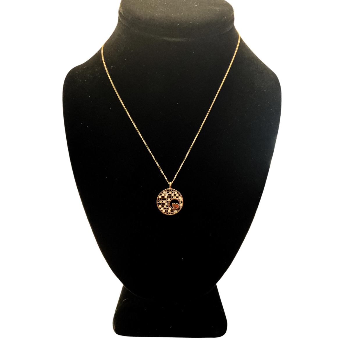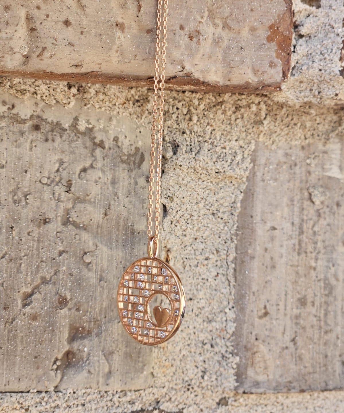 Round pendant with a small red heard inside, covered with zirconium. It is made of 925 carat silver and colored with rose color. The chain is also 925 carat silver with rose color.