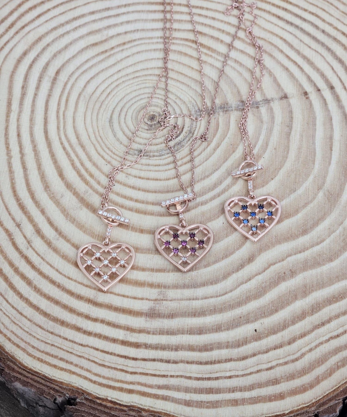 Elegant rose gold color 925 carat silver heart pendants adorned with sparkling zirconia stones in pink, white, and blue. Each pendant comes with a matching silver chain, making it a perfect gift or accessory for any occasion. Choose your favorite stone color at checkout to match your personal style.