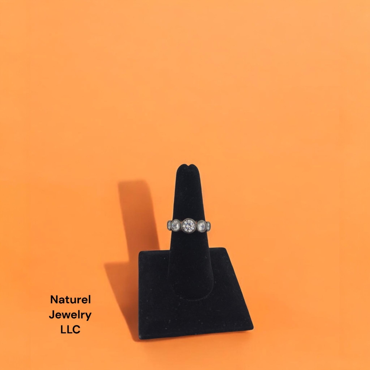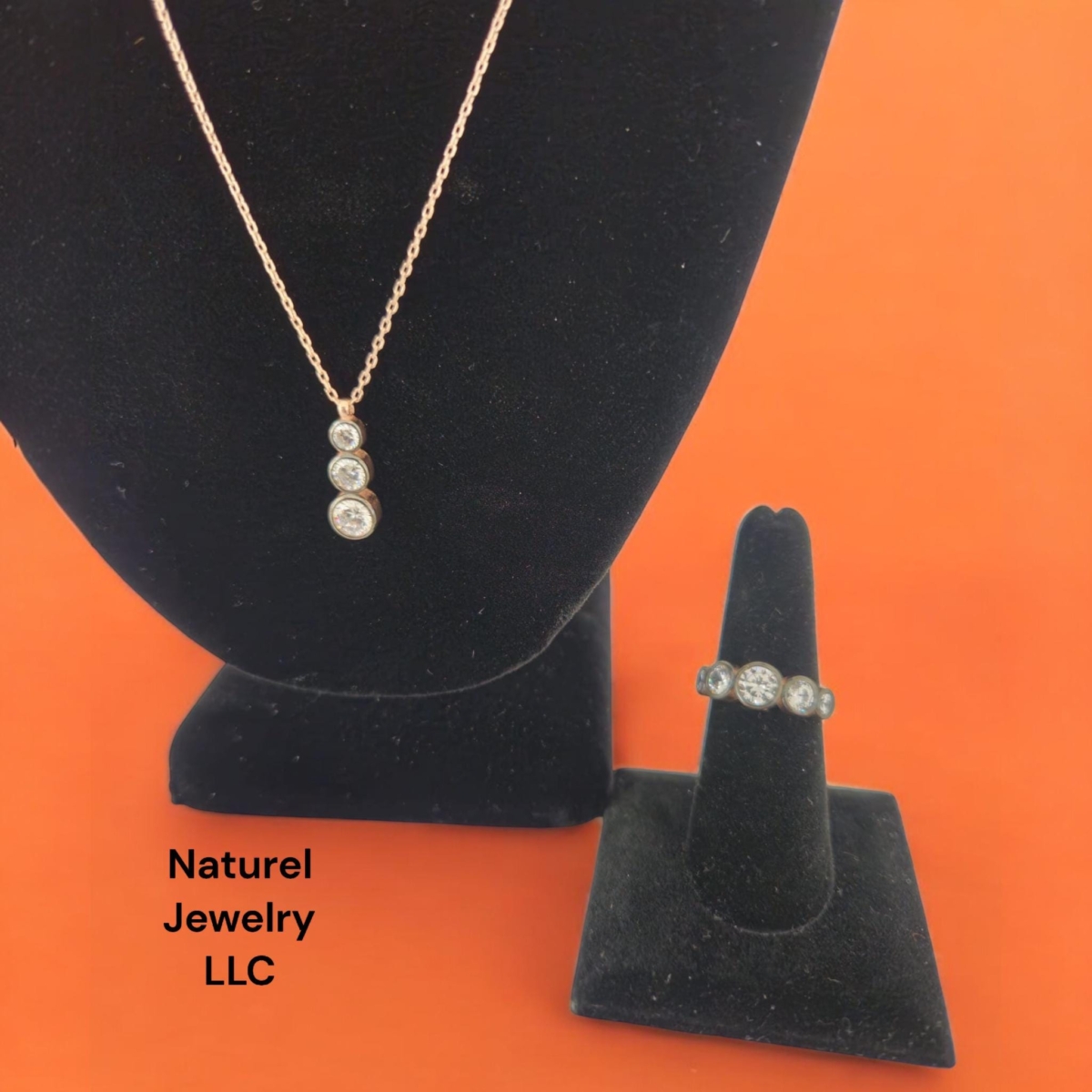 Silver Rose Color Ring assambled by 5 white zircon and is a set with 3 zircon drop pendant with Necklace set.Ring size 8, necklace max height with pendant is 10 inches. Necklace is adjustable.